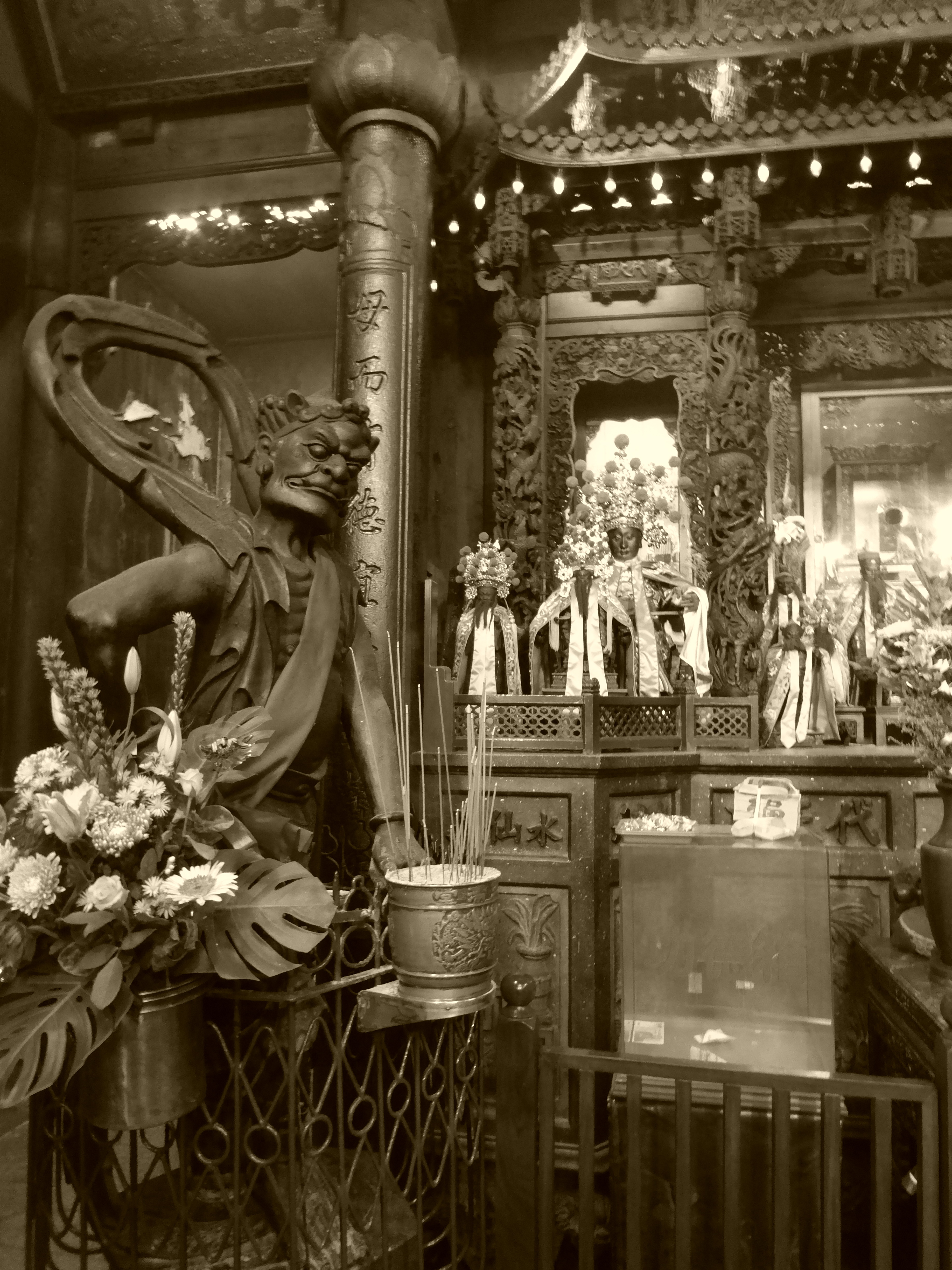 Goldene, rote, grüne Drachen schlängeln sich um die Dachfirste des Longshan-Tempels, verzieren Bronzesäulen und kauern qualmend an riesigen Kesseln wie echte Fabelwesen. „In Taiwan“, erklärt uns Johannes, dessen taiwanesischer Name Mr. Xu zi yi lautet, „gibt es für jedes Anliegen den richtigen Gott, den man um Hilfe anflehen kann. Vom Heirats-Gott über den Taxifahrergott, bis hin zum Gott der Seefahrer.“ Dem Taoismus ist diese Mannigfaltigkeit zu verdanken, der in Taiwan eine fruchtbare Allianz mit dem Buddhismus einging. Um mich herum beten zahlreiche Taiwaner, sie erhoffen sich Antwort und handfeste Unterstützung von den Göttern: Sie bringen Opfergaben dar wie Äpfel, die man übrigens nach der Zeremonie wieder mit nach Hause nehmen kann, entzünden Räucherstäbchen und ziehen schließlich das Orakel zu Rate bei der Deutung der mysteriösen Ergebnisse der Götter-Befragung.